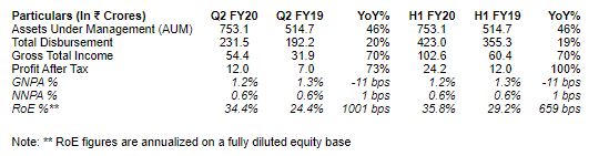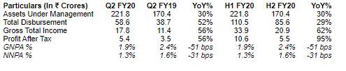 - Net Profit grew by 56 per cent YoY in Q2 FY20 and 95 per cent YoY in H1 FY20 driven by higher blended yields and lower provisions in the MSME segment compared to 2W segment.