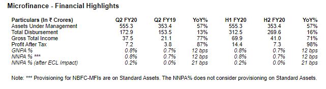 - MFI AUM stood at Rs 555.3 crores in Q2 FY20 growth of 57 per cent YOY