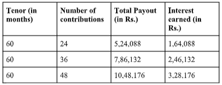 Take a look at how you can grow your savings assuming you are a regular customer making 24, 36, and 48 monthly deposits of Rs.15,000 each. The interest rate you get for a 60-month tenor is 7.8 percent.