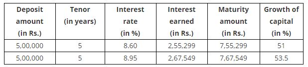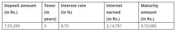 Continuing with the previous example, assume that you re-invest your returns of Rs 7,55,299 for a tenor of three years. You will gain an additional interest rate of 0.10 per cent. Here is what your returns will be.