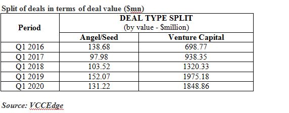 Startup activity started on a weak note in Q1 2020, with Angel/Seed witnessing 136 deals worth 131.22 million dollars and Venture Capital with 93 deals worth 1.85 billion dollars (a five year low in Venture Capital funding).