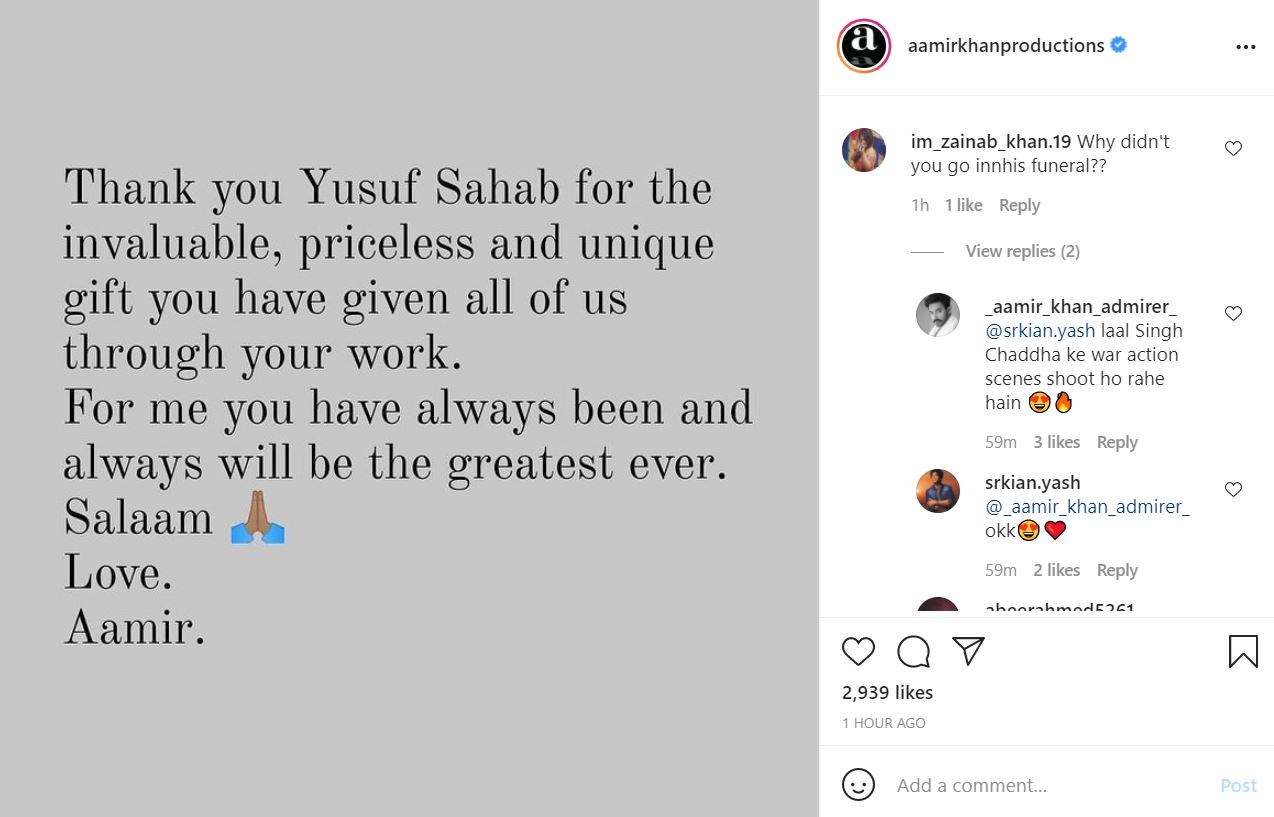 "Thank you Yusuf Sahab for the invaluable, priceless and unique gift you have given all of us through your work. For me you have always been and always will be the greatest ever. Salaam. Love. Aamir," the actor wrote on the Instagram handle of his company 'Aamir Khan Productions'.