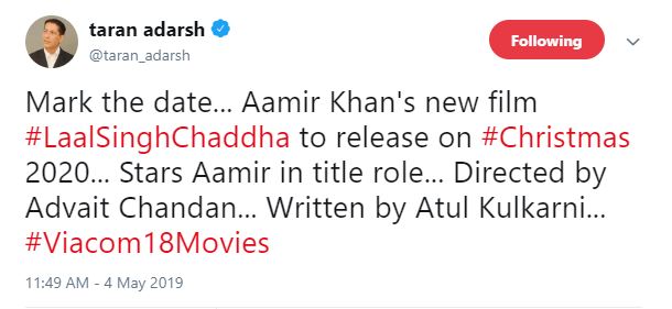 Film critic and trade analyst Taran Adarsh announced the news on his Twitter handle and wrote, "Mark the date... Aamir Khan's new film Laal Singh Chaddha to release on Christmas 2020... Stars Aamir in the title role... Directed by Advait Chandan... Written by Atul Kulkarni...."The film helmed by Advait Chandan will be an adaptation of the 1994 Hollywood classic 'Forrest Gump'. The film penned by Atul Kulkarni will hit theatres 2020, next year at Christmas.