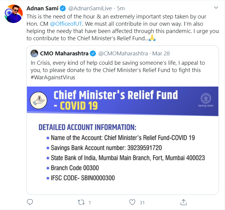 Adnan Sami extends support, urges people to contribute to COVID-19 relief efforts