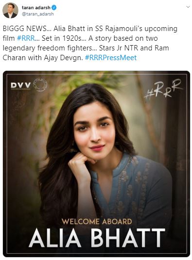 He wrote, “BIGGG NEWS... Alia Bhatt in SS Rajamouli's upcoming film #RRR... Set in 1920s... A story based on two legendary freedom fighters... Stars Jr NTR and Ram Charan with Ajay Devgn. #RRRPressMeet.”