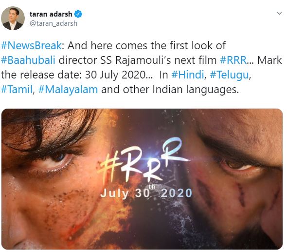 “#NewsBreak: And here comes the first look of #Baahubali director SS Rajamouli’s next film #RRR... Mark the release date: 30 July 2020... In #Hindi, #Telugu, #Tamil, #Malayalam and other Indian languages,” he wrote.