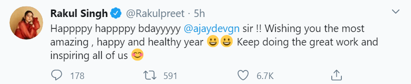 Actor Rakul Preet, who shared screen space with Ajay in Luv Ranjan's 'De De Pyaar De' last year, extended her birthday wishes on Twitter.