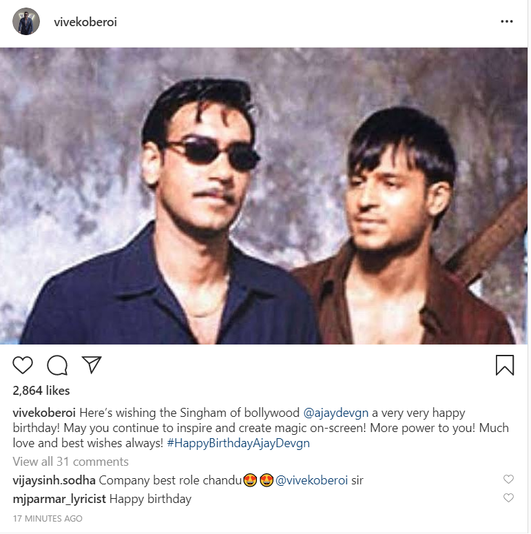 Sharing a throwback picture with the "Singham of Bollywood," actor Vivek Oberoi hopped on to Instagram to share his birthday wishes.