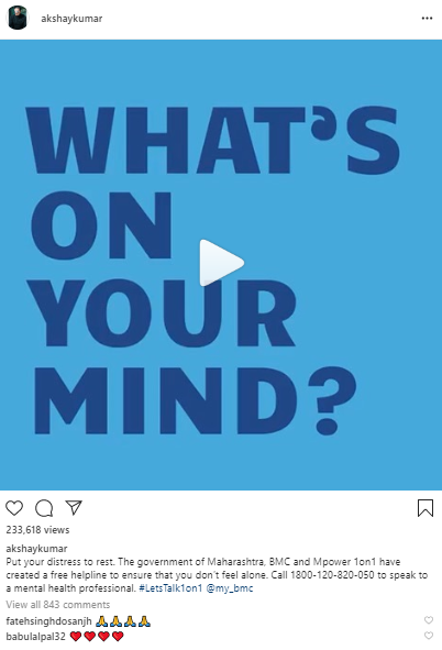 "Put your distress to rest. The government of Maharashtra, BMC and Mpower 1on1 have created a free helpline to ensure that you don't feel alone. Call 1800-120-820-050 to speak to a mental health professional. #LetsTalk1on1 @my_bmc," Akshay Kumar captioned the post.