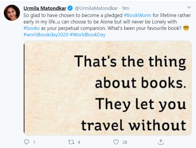 Earlier the day, seasoned actor Urmila Matondkar took to twitter to express her happiness of being a 'bookworm.'