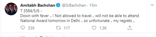 The 77-year-old actor took to Twitter and said, "Down with fever .. ! Not allowed to travel .. will not be able to attend National Award tomorrow in Delhi .. so unfortunate .. my regrets .."