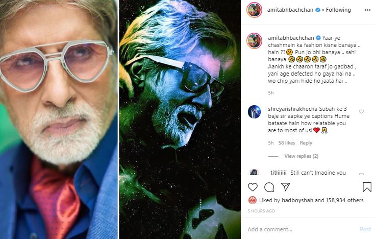 The 77-year-old actor, going by his caption, seemed to be in the mood for fun as he wrote, "Yaar ye chashmein ka fashion kisne banaya .. hain ?? Pun jo bhi banaya .. Sahi banaya