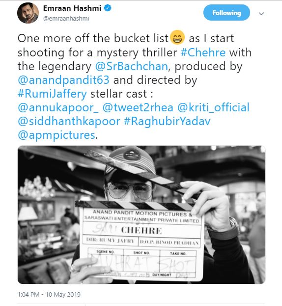 An elated Hashmi shared a picture of him with the clapper board and wrote, "One more off the bucket list as I start shooting for a mystery thriller Chehre with the legendary Amitabh Bachchan, produced by Anand Pandit and directed by Rumi Jaffery stellar cast: Annu Kapoor, Rhea Chakraborty, Kriti Kharbanda, Siddhanth Kapoor, Raghubir Yadav."