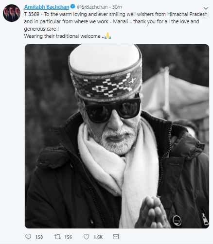 Sharing the picture on Twitter, Big B wrote, "To the warm loving and ever-smiling well-wishers from Himachal Pradesh, and in particular from where we work - Manali .. thank you for all the love and generous care! Wearing their traditional welcome."