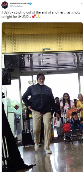 The 'Shehenshah' actor shared his picture from the airport on his Twitter handle and wrote, "striding out of the end of another .. last shots tonight for JHUND."