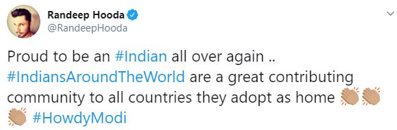 Actor Randeep Hooda also tweeted, "Proud to be an #Indian all over again .. #IndiansAroundTheWorld are a great contributing community to all countries they adopt as home. #HowdyModi."