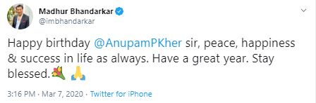 One of the early ones to wish was film director Madhur Bhandarkar who wished the 'Hotel Mumbai' actor on Twitter saying: "Happy birthday @AnupamPKher sir, peace, happiness & success in life as always. Have a great year. Stay blessed."