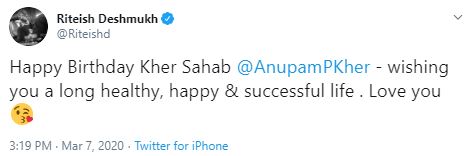 Riteish Deshmukh conveyed birthday greetings to the 'DDLJ' actor on Twitter and wrote, Happy Birthday Kher Sahab @AnupamPKher- wishing you a long healthy, happy & successful life. Love you" (along with a kissing emoji)