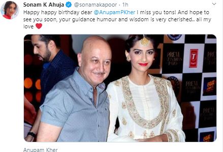 Sonam Kapoor shared a picture along with Kher and conveyed a heart-warming wish on Twitter. "Happy happy birthday dear @AnupamPKherI miss you tons! And hope to see you soon, your guidance humour and wisdom is very cherished.. all my love," she tweeted.