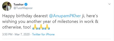 Tusshar Kapoor wished another year of milestones to Kher on his 65th birthday on Twitter, he tweeted, "Happy birthday dearest @AnupamPKher ji, here's wishing you another year of milestones in work & otherwise, too!"