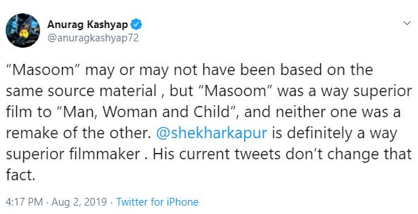 "'Masoom' may or may not have been based on the same source material, but 'Masoom' was a way superior film to "Man, Woman and Child", and neither one was a remake of the other. Shekhar Kapur is definitely a way superior filmmaker. His current tweets don't change that fact," tweeted Anurag.