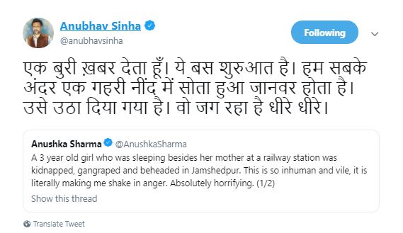 Meanwhile, retweeting Anushka's tweet, filmmaker Anubhav Sinha wrote, "Let me give a bad news. This is just the start. We all have a sleepy wild animal inside ourselves. That animal is awaking slowly slowly."