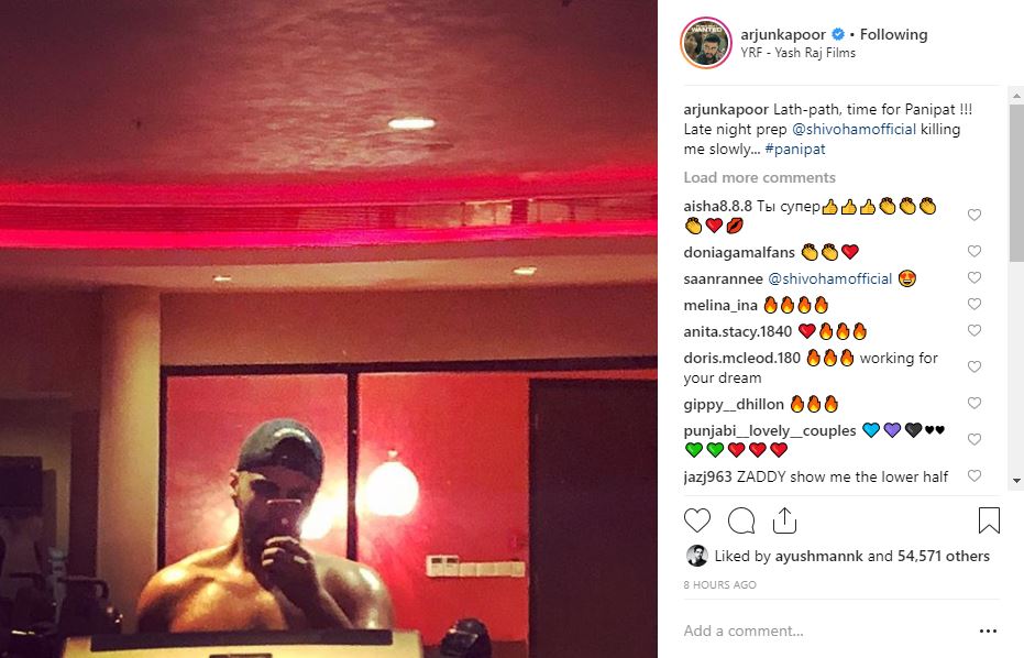 He captioned the post, “Lath-path, time for Panipat !!! Late night prep @shivohamofficial killing me slowly... #panipat.”