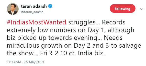Indian film critic Taran Adarsh shared the collection on his Twitter handle and wrote, "Indias Most Wanted struggles... Records extremely low numbers on Day 1, although biz picked up towards evening... Needs miraculous growth on Day 2 and 3 to salvage the show... Fri Rs 2.10 cr. India biz."