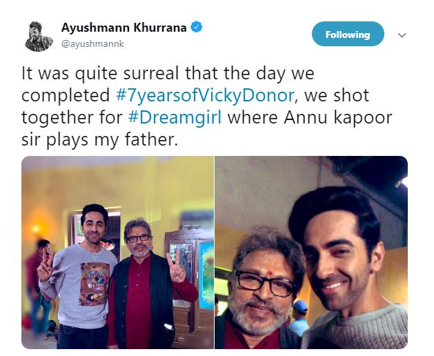 He wrote alongside the photos, “It was quite surreal that the day we completed #7yearsofVickyDonor, we shot together for #Dreamgirl where Annu kapoor sir plays my father.”