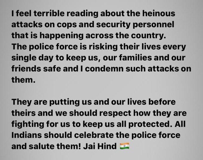 "I feel terrible reading about the heinous attacks on cops and security personnel that is happening across the country. The police force is risking their lives every single day to keep us, our families and our friends safe and I condemn such attacks on them," the 35-year-old actor said.