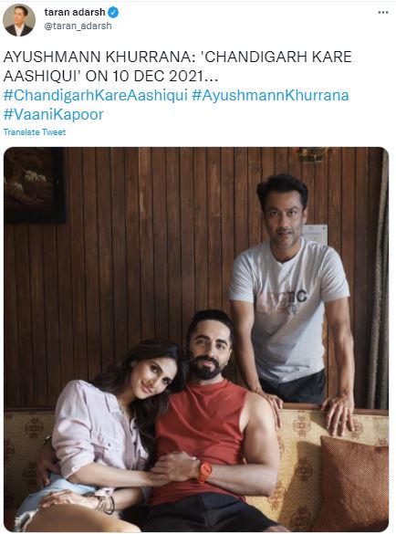The news was shared on Twitter by film critic and trade analyst Taran Adarsh, who tweeted, "AYUSHMANN KHURRANA: 'CHANDIGARH KARE AASHIQUI' ON 10 DEC 2021... #ChandigarhKareAashiqui #AyushmannKhurrana #VaaniKapoor."