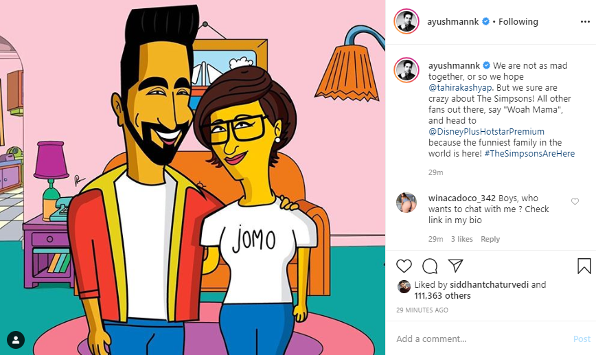 The 'Article 15' actor wrote in the caption: "We are not as mad together, or so we hope @tahirakashyap. But we sure are crazy about The Simpsons!"