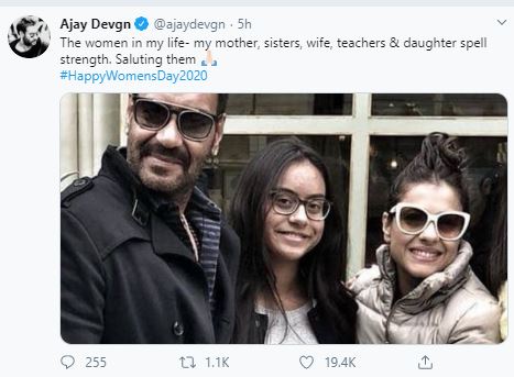 Ajay Devgn shared an adorable picture with wife Kajol and daughter Nysa Devgan in a women's day celebratory post on Twitter. He captioned it as," The women in my life- my mother, sisters, wife, teachers & daughter spell strength. Saluting them #HappyWomensDay2020."