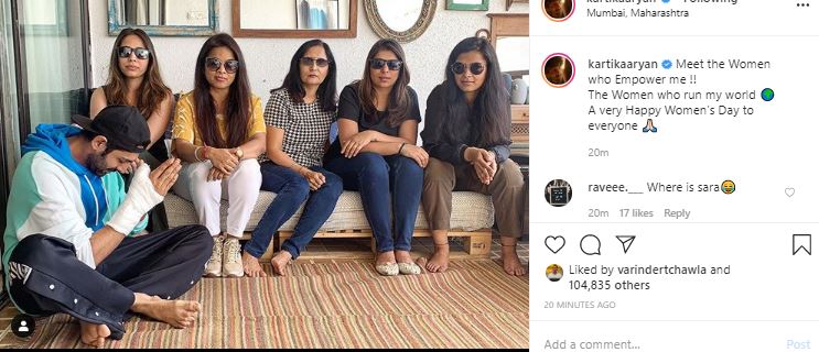 Kartik Aaryan shared a picture along with the women who empower him in a Women's Day special post on Instagram. He wrote, "Meet the Women who Empower me !! The Women who run my world A very Happy Women's Day to everyone."