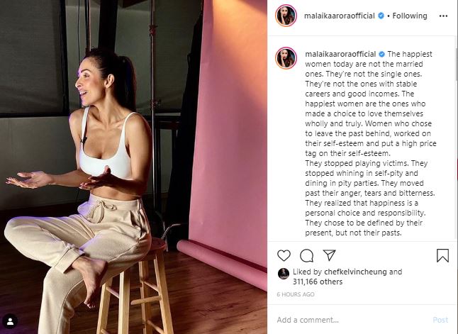 Malaika Arora shared a special message for the married women on Instagram along with her picture. She wrote, "The happiest women today are not the married ones. They're not the single ones. They're not the ones with stable careers and good incomes. The happiest women are the ones who made a choice to love themselves wholly and truly. Women who chose to leave the past behind worked on their self-esteem and put a high price tag on their self-esteem.