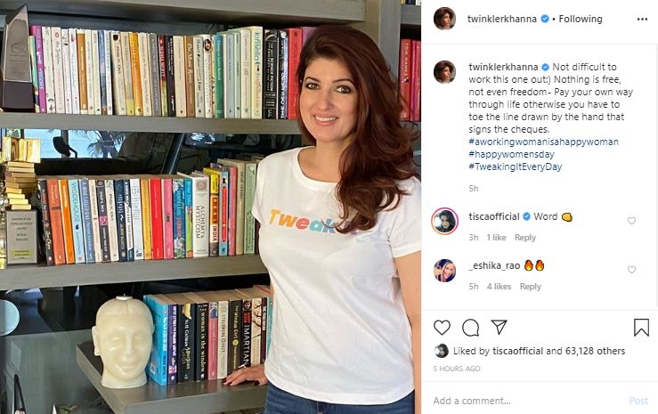 Twinkle Khanna paid a tribute to the working women on the International Women's Day on Instagram as she posted her picture standing by the bookshelf. She captioned the post as, "Not difficult to work this one out:) Nothing is free, not even freedom- Pay your own way through life otherwise you have to toe the line drawn by the hand that signs the cheques. #aworkingwomanisahappywoman #happywomensday #TweakingItEveryDay."