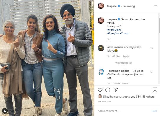 Taapsee Pannu also took to Instagram to share a picture along with her family after they cast their vote. She wrote, "' Pannu Parivaar' has voted. Have you? #VoteDelhi #EveryVoteCounts,"
