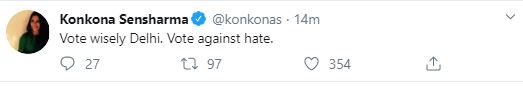 Konkona Sen also shared a tweet and wrote, "Vote wisely Delhi. Vote against hate."