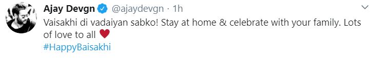 Ajay Devgn took to Twitter and extended Vaisakhi wishes. He tweeted, "Vaisakhi di vadaiyan sabko! Stay at home & celebrate with your family. Lots of love to all #HappyBaisakhi" (ANI)