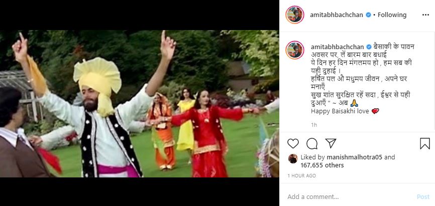 Amitabh Bachchan took to Instagram and shared a throwback picture from one of his movies where he is seen dressed up in a white dress up sporting a traditional Kurta Pyjama with a black embellished waistcoat while he dances in front of the background dancers.