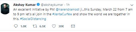 Akshay Kumar took to Twitter saying that the Janta curfew was an excellent initiative by the PM and he urged everyone to follow the directive given on March 22 .He tweeted, An excellent initiative by PM @narendramodi ji...this Sunday, March 22 from 7 am to 9 pm let's all join in the #JantaCurfew and show the world we are together in this. #SocialDistancing."