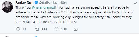 Sanjay Dutt took to Twitter and spread the Prime Minister's message of 'Janta Curfew'. He tweeted, "Thank You @narendramodi ji for such a reassuring speech. Let's all pledge to adhere to the Janta Curfew on 22nd March, express appreciation for 5 mins at 5 pm for all those who are working day & night for our safety. Stay home to stay safe & take all the necessary precautions!"