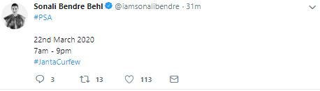 Sonali Bendre shared the Public Service Announcement on Twitter and wrote, "#PSA 22nd March 2020 7am - 9 pm #JantaCurfew."
