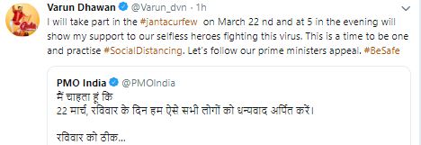 Varun Dhawan announced to take part in the 'Janta Curfew' as suggested by the Prime Minister in the address to the nation on coronavirus. He shared the post on Twitter that reads, "I will take part in the #jantacurfew on March 22 nd and at 5 in the evening will show my support to our selfless heroes fighting this virus. This is a time to be one and practise #SocialDistancing. Let's follow our prime minister's appeal. #BeSafe."