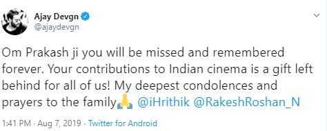 Ajay Devgn expressed grief and wrote, "Om Prakash ji you will be missed and remembered forever. Your contributions to Indian cinema is a gift left behind for all of us! My deepest condolences and prayers to the family."