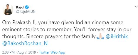 Ajay's wife Kajol also tweeted condolences, "Om Prakash Ji, you have given Indian cinema some eminent stories to remember. You'll forever stay in our thoughts. Sincere prayers for the family."