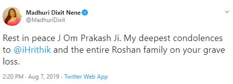 Madhuri Dixit Nene too mourned over the loss of J Om Prakash and tweeted, "Rest in peace J Om Prakash Ji. My deepest condolences to Hrithik and the entire Roshan family on your grave loss."