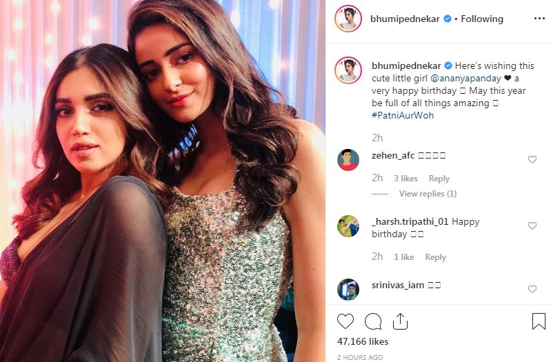 The 'Pati, Patni or Woh' co-star Bhumi Pednekar also wished by sharing a picture with her on Instagram, saying "Here's wishing this cute little girl @ananyapanday a very happy birthday. May this year be full of all things amazing #PatniAurWoh"