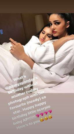 'Student of the year 2' co-actor Tara Sutaria while sharing a picture cuddling Ananya, captioned the Instagram story as"What's@ananyapanday's birthday without another cuddling photograph with her favourite (needy) co-star...Happy happy birthday little Scorpio baby AP!!!! Here's to you."