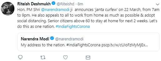 Riteish Deshmukh took to Twitter and spread the PM's message in a post that reads, "Hon. PM Shri @narendramodi Ji announces 'Janta curfew' on 22 March, from 7 am to 9 pm. He also appeals to all to work from home as much as possible & adopt social distancing. Senior citizens above 60 to stay at home for the next 2 weeks. Let's do this as one nation. #IndiaFightsCorona."